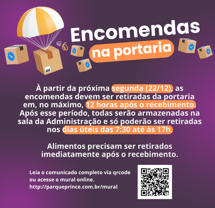 As encomendas deverão ser retiradas na portaria em até 12 horas após o recebimento.